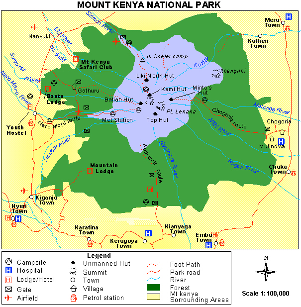 肯尼亚山是东非大裂谷最大的死火山,位于肯尼亚中部。最高峰海拔5199米,是仅次于吉力马扎罗山的非洲第二高峰。它穿越赤道线,平时烟雾缭绕,峰顶若隐若现,而在晴朗的日子里几英里以外都可以看到屹立在远处的雪峰。巨大冰河形成的山谷紧靠群山,一片瑰丽的景色。山顶终年积雪,并有15条冰川伸延到4300米处。
