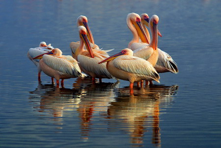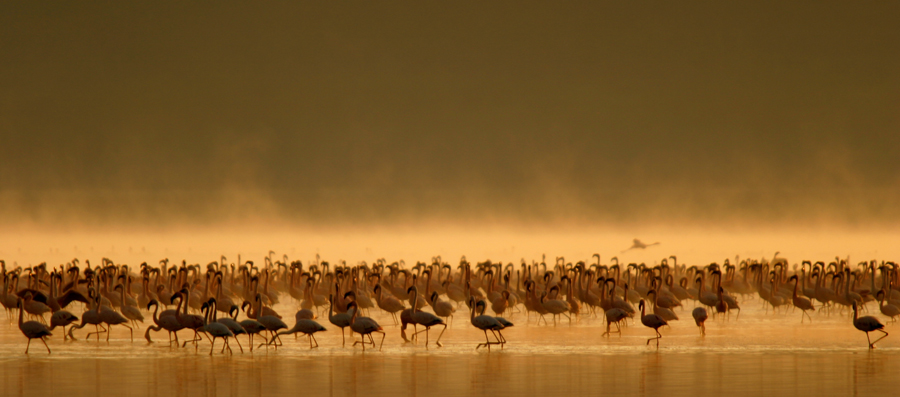 火烈鸟又名大红颧是徙禽,喜欢结群, 分布于地中海沿岸机动到印度洋西北部,南至南非南部,西达西印度群岛,火烈鸟形似鹤,颈长而曲,脚极长,只见有蹼,白色体羽中透着玫瑰色,飞羽黑,腹羽深红,诸色相称,艳丽非凡。该鸟以小虾,蛤蜊,昆虫,藻类为食,因纳库鲁湖自然条件适宜,该湖的碱性成分以及赖以为生的藻类构成丰富的食粮引来无数火烈鸟,达220万只之多,占世界火烈鸟总数的三分之二。此外,还有许多动物,包括非常稀有的白犀牛。每年年底到次年3月为观看火烈鸟的最佳时期。